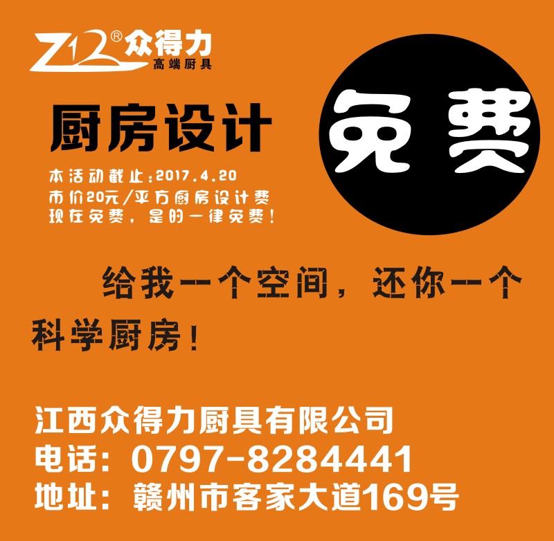 贛州廚具好消息,我公司推出免費廚房裝修設計拉,如您正在裝修廚房,食堂后廚整體規劃,眾得力廚具為您提供免費廚房裝修設計圖紙,而且是業內非常專業廚房設計!因為我們專業,也是為了更好的服務客戶,選擇我們,我們將全力以赴為您服務!